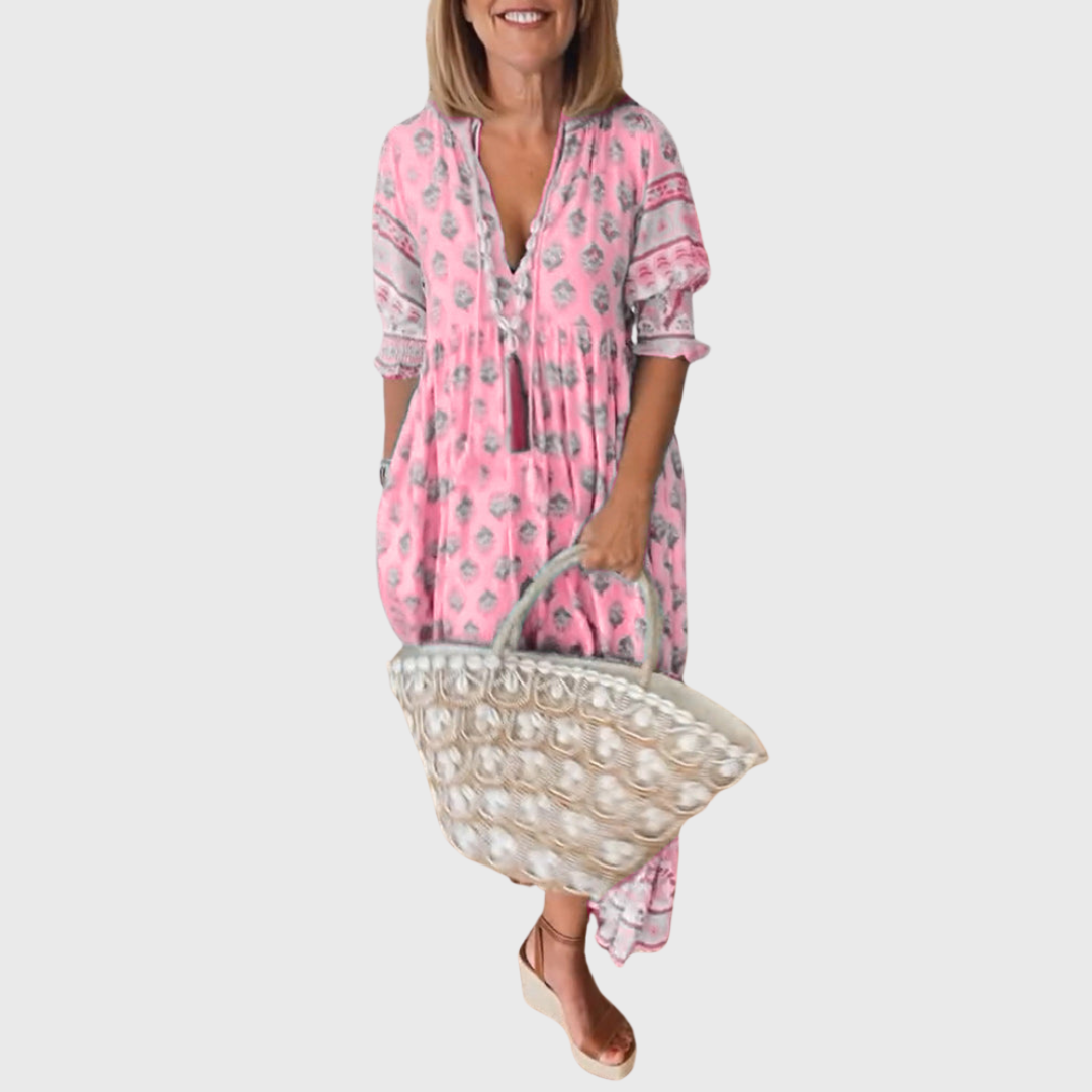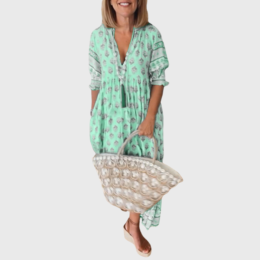Тази бохо рокля внася лекота и безгрижие във вашия стил. Летящият крой с V-образно деколте и детайли на ръкавите осигурява перфектен баланс между комфорт и женственост. Идеална е за летни разходки, почивка на море или срещи с приятели, а проветливият материал я прави отличен избор както за топли дни, така и за вечерни отпуски.