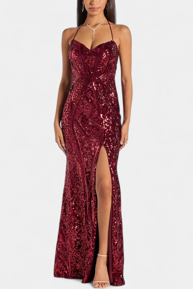 Очарователен силует, който излъчва магнетизъм и изтънченост. Марияна се отличава с халтер дизайн, който подчертава фигурата и блестящ завършек от пайети, който улавя всеки отблясък на светлината. Нейният ласкателен крой прави роклята перфектен избор за да бъдете в центъра на вниманието.