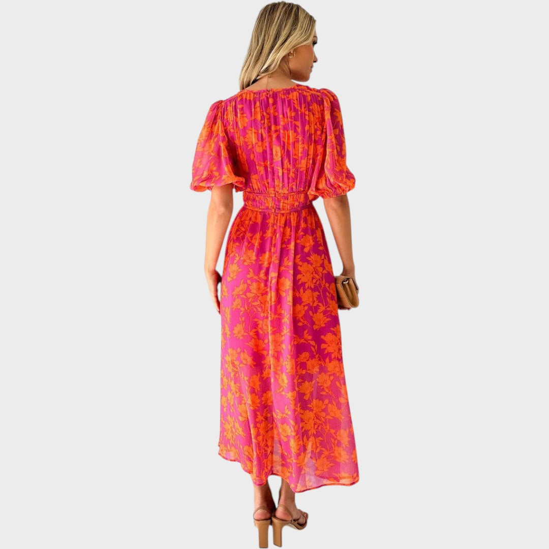 Тази рокля излъчва женственост и лекота. Дълбокото V-образно деколте в комбинация с акцентирания талия подчертава фигурата, докато леките материи и ефирният крой позволяват елегантно движение. Ръкавите тип пъф придават романтичен стил, правейки я перфектен избор за тържествени поводи, летни вечери или романтични разходки.