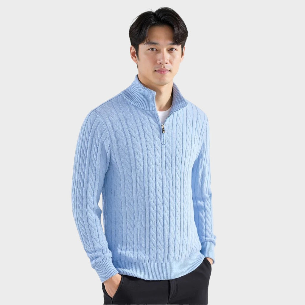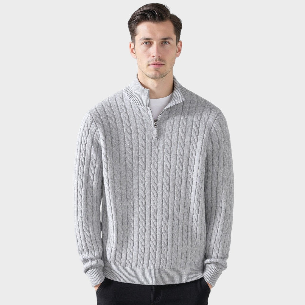 Стилен и удобен пуловер, който комбинира класически дизайн с модерен акцент. Изработен от мека и висококачествена материя, той осигурява комфорт и топлина през целия ден. Фините плетени детайли добавят изтънченост, а ципът в горната част позволява лесно регулиране според настроението и повода. Подходящ както за ежедневието, така и за по-елегантни случаи.