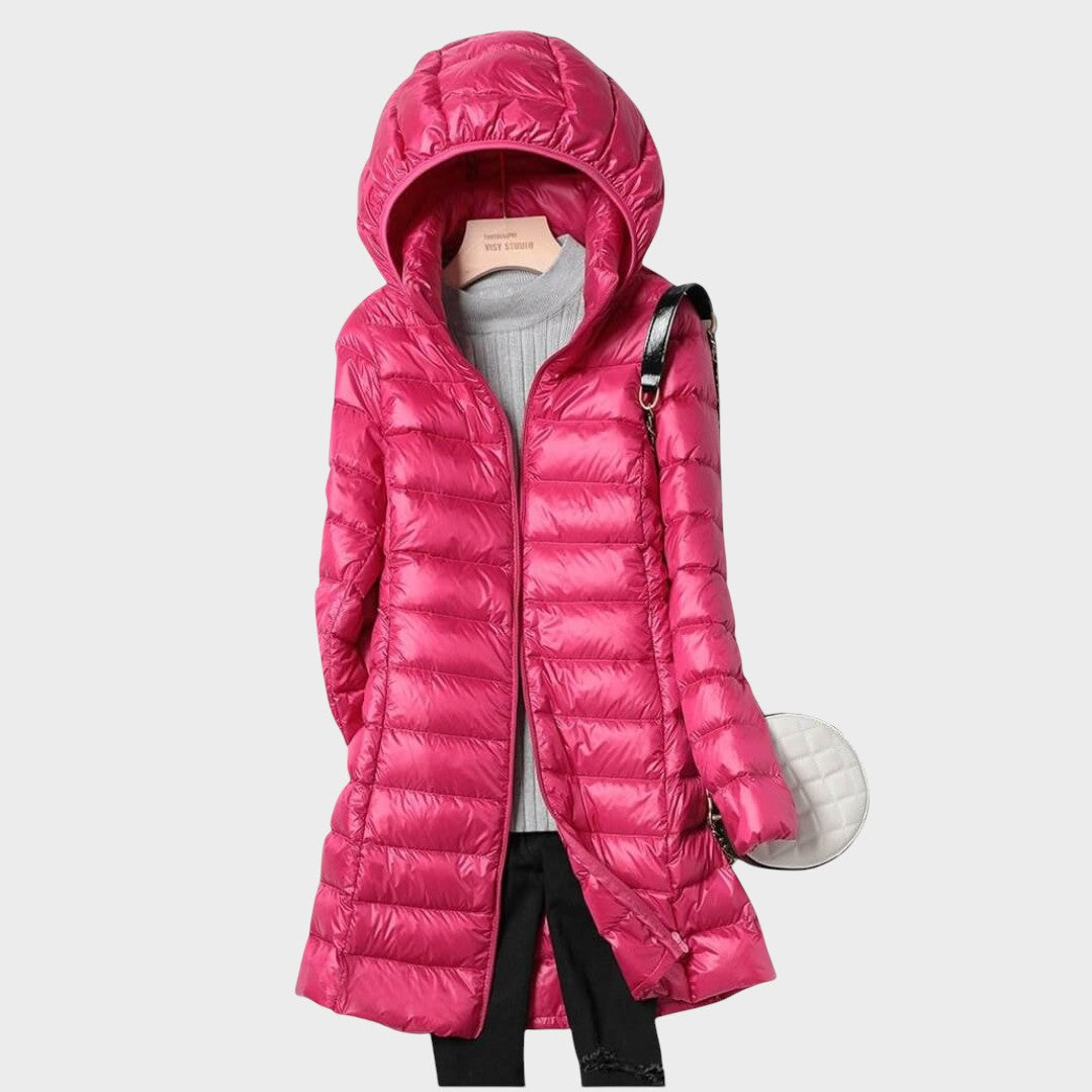 Това стилно дълго пухено яке е създадено, за да ви предпази от студа с комфорт и изисканост. Моделът предлага перфектен баланс между модерен силует и практичност, като осигурява отлична топлоизолация дори при най-ниските температури. С високата яка и удобната качулка ще се чувствате уютно и защитени през цялата зима.